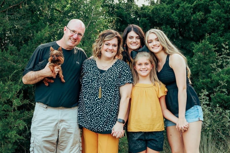 Brown Family: Husband Chance, our Yorkie Stella, me, Karly (wallflower), Presley (wildflower), and Brinkley (family actress/comedian)